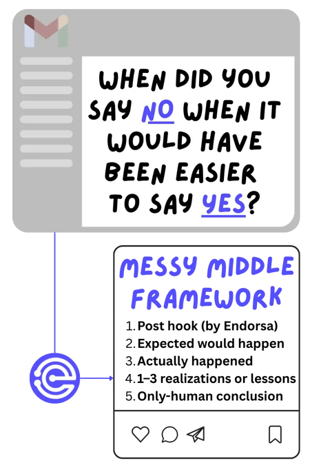 - Based on your responses, Endorsa suggests a post framework and drafts an opening line to hook your LinkedIn audience.